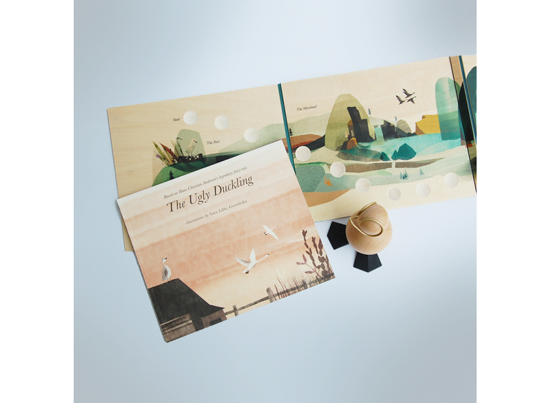 Genoplev historien om Den Grimme Ælling med kortet, bogen og Den grimme Ælling. Kollektionen består altså af tre dele, hvor bogen er eventyret, baseret på et af H.C. Andersens tidsløse klassikere, ”Den Grimme Ælling”. Et bræt, der forestiller kortet for Ællingens rejse i historien og endelig hovedpersonen, nemlig Den grimme Ælling. Flyt Ællingen rundt på kortet alt imens du læser historien og har en samtale ud fra spørgsmålene i slutningen af bogen med dine børn. Både til helt små- og lidt større børn. Aviendo Fairytales er et resultat fra et samarbejde af tre danske designere. Nemlig Sara Lillie Gornitzka, som har illustreret de smukke sider. Mikkel Lang Mikkelsen og Mads Hanghøj, som har designet den ikoniske grimme Ælling.