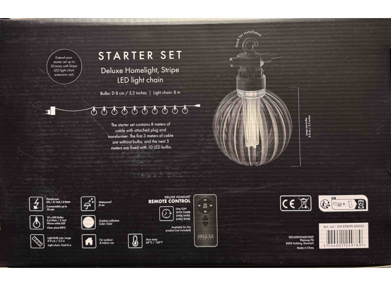 Et langt bord, lækker mad og den perfekte stemning. DeluxeHomeArt’s dæmpbare lyskæde med 10 lys kan snoes i træerne eller hænges over terrassen – og pludselig føles det som en middag under åben himmel i Toscana. Med en længde på 8 meter og velegnet til både inde og ude skaber den magisk belysning. Ønsker du endnu mere lys? Tilføj en forlængerset og byg videre på din lyskæde.Modtager :