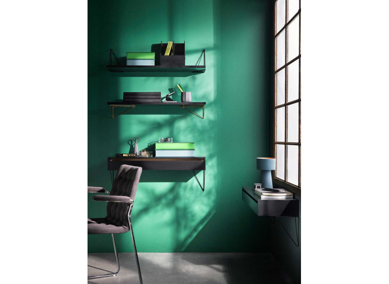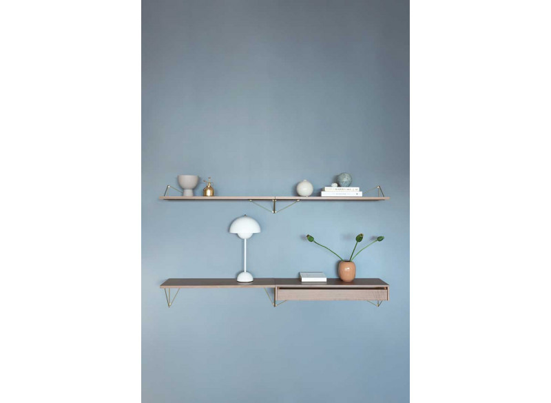 Pythagoras er et meget flexibelt hyldesystem. Her fås hyldene i hvid, sort samt eg- og valnød-finer. Brug hylden sammen med Pythagoras hyldeknægte og byg en flot og flexibel vægreol som kan udvides og bygges på ved behov.