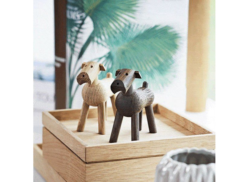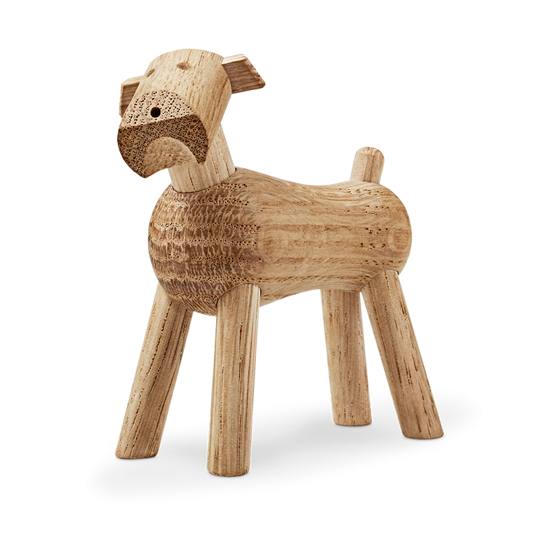 Her er hunden Tim, som Kaj Boyesen designet tilbage i 1935. Den søde terrier, med det drejelige hoved på skrå, og halen lige i vejret er det nyeste medlem af hans familien af træfigurer. En god gaveidé til en særlig anledninger. Tim finds i både almindlig egetræ samt røget egetræ.