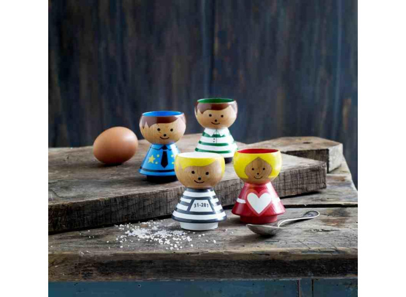 De farverige små æggebærere er en fornøjelse at se på med deres enkle design og farverige tøj, der appellerer til barnet i os alle. Med Kollektion "Bordfolk" har det danske designfirma Lucie Kaas givet nyt liv til de dansk designede æggebærere, som man kunne finde på alle morgenborde i 1960'erne og 1970'erne.