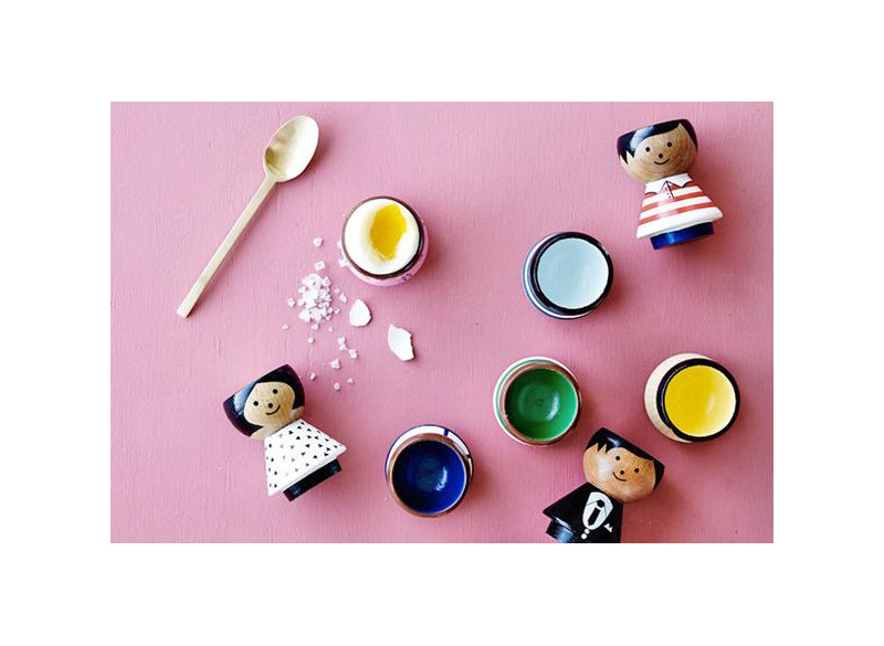 Den danske designvirksomhed Lucie Kaas, har med kollektionen Bordfolk, relanceret, opdateret og givet nyt liv til de dansk designede æggebægere der forsirede morgenbordene i 60’erne og 70’erne. Med deres enkle design i flotte og klare farver er de kulørte trævarer en fornøjelse at se på – med en umiddelbar appel til barnet i os alle. Hvert enkelt æggebæger, som er af bøgetræ, er unikt og håndmalet.