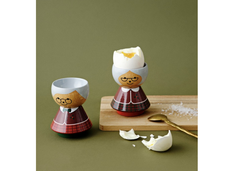 Disse farverige små æggebægre er en fornøjelse at se på med deres enkle design og livlige tøj, der vækker barnet i os alle. Med *Bordfolk*-kollektionen har det danske designfirma Lucie Kaas pustet nyt liv i de klassiske danske æggebægre, der prydede morgenborde i 1960’erne og 1970’erne – nu i en festlig juleudgave.