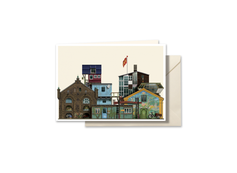 Her har du Martin Schwartz flotte postkort af Christiania. Det er udgivet som en del af en hel serie med postkort over kendt områder i København. Ud over Christiania kortet findes der følgende kort: Christianshavn, Nyhavn; Vesterbro, Strøget og Søerne. Postkortene egner sig også til at rammes ind hvis man ønsker en smuk billeder serie over København på væggen.