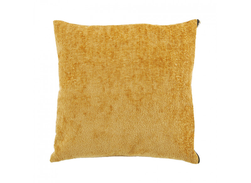 Flot pude i groft vævet gult chenille stof med velour bagside i sennep farve. Betrækket har lynlås og kan tages af og vaskes på 30 grader. Inderpude af gåsedun. Mål 45x45 cm -