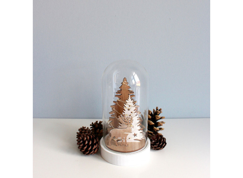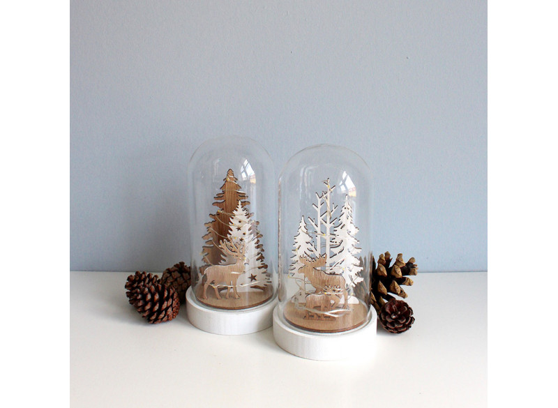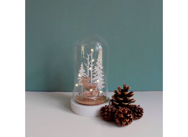 Glaskuppel med 2 fine vintermotiv med enten en hjort eller med en lille elg famlie i skoven. Kuppelen har en lille indebygget LED-lyskæde som giver hygge og stemning. Kuppelen skal bruge 2xAAA batterier for at give lys - batterier medfølger ikke. H20 cm