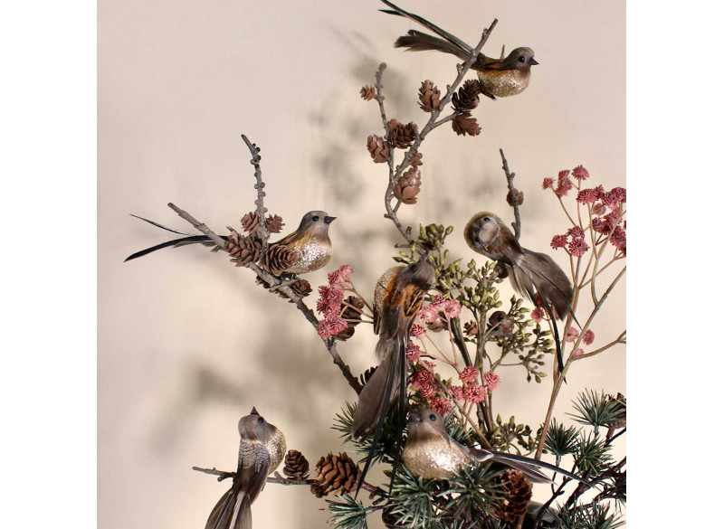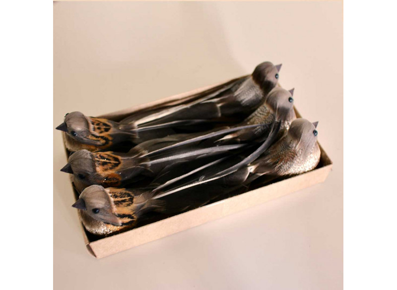 Gaveæske med 6-pak med assorterede spurve med glimmer på brystet. Spurvene har en metal klemme under som gør det nemt at dekorerer med dem på en gren, buket eller på granen til jul. spurvene er ca 13 cm.Modtager :
