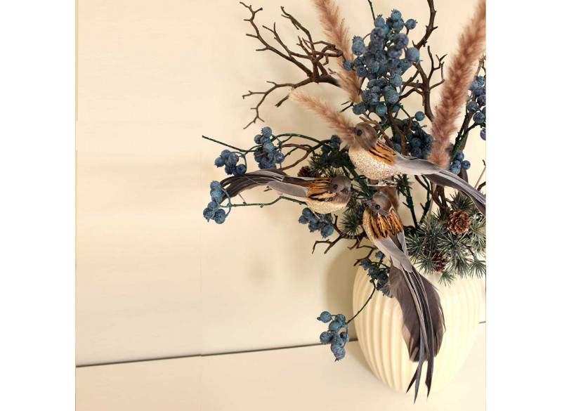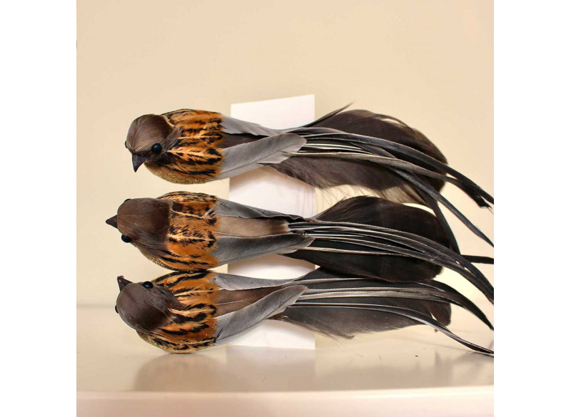 Smuk elegant fugl med lange halefjer. Fuglen kommer i brune og grå nuancer med guldglimmer på brystet som gør den virkelig flotte til dekoration. Med den lille klemme som sidder under fuglen er det nemt at fæste på en gren eller på en dekoration eller på juletræet. Fuglen måler ca 18 cm.Modtager :