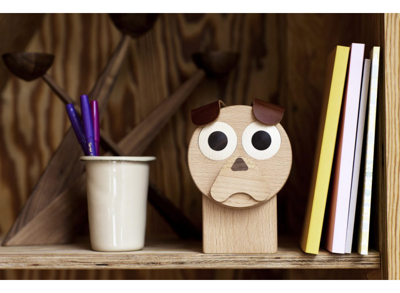 Tinder Dog er lavet i bøg, ahorn og valnød. Ørerne og halen er i kolæder.