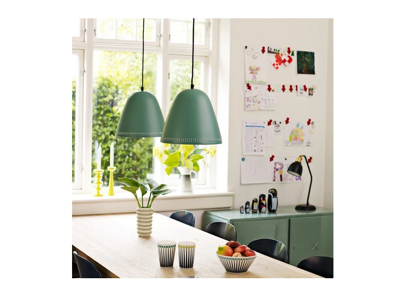 Stor loftslampe i mat smoke Blue metal med perforeret kant, der giver et dejligt lysspil.