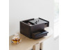 Stilfuldt smykkeskrin med opbevaringsskuffe. Øverste skuffe har åben opbevaring og stofpuder til ringe. Nederste skuffe kan gemme større halskæder og armbånd.