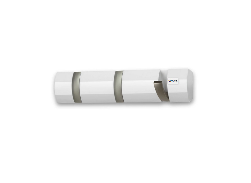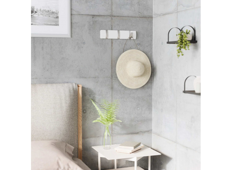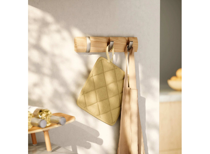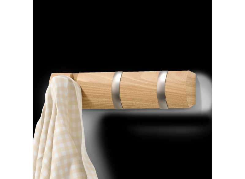 Denne vægmonterede knagerække har tre flip kroge som trækkes ned efter behov. Den er lavet af egetræ med børstede nikkel kroge. ( 33 x 7 x 3,8 cm ) Hver krog holder op til 2,26 kg.