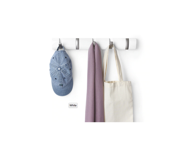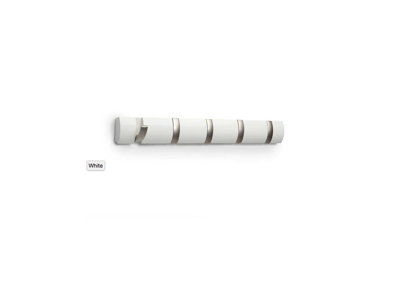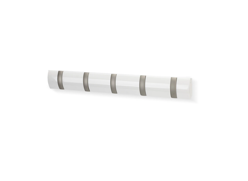 Denne vægmonterede knagerække har fem flip kroge som trækkes ned efter behov. Den er lavet af egetræ i hvid lakeret finish med børstede nikkel kroge. ( 50,8 x 7 x 3,8 cm ) Hver krog holder op til 2,26 kg.