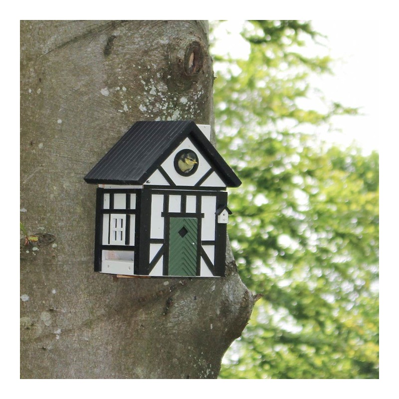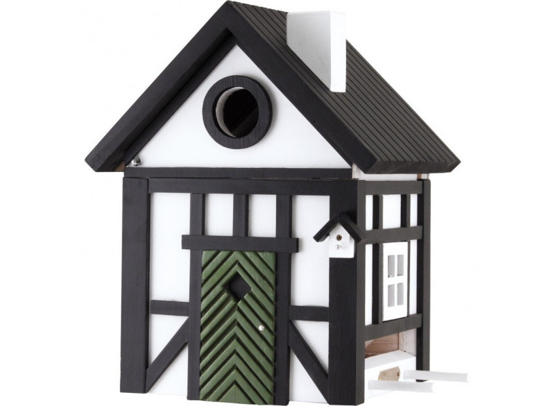 Multiholk bindingsværkshuse fungerer som en birdhouse i foråret og sommeren, og derefter omdannet til en fugl feeder i efteråret. Det er lavet af massivt træ og malet med miljøvenlige malinger.