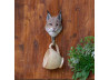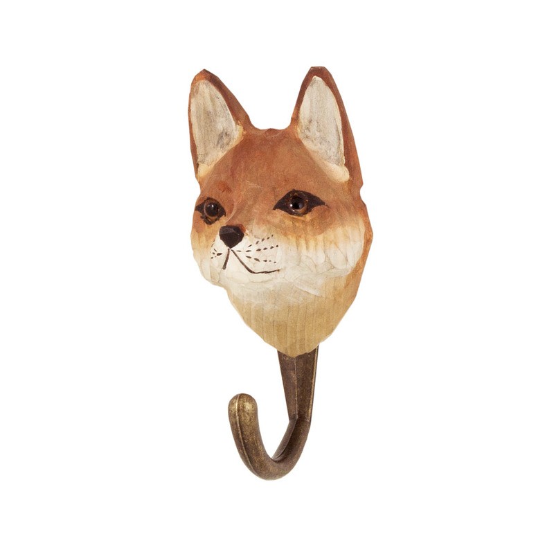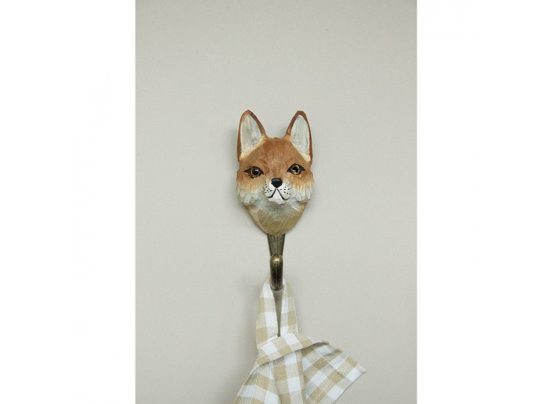 Håndskåret dyreknage af en ræv i træ, håndkoloreret, krog i bronzefarvet metal