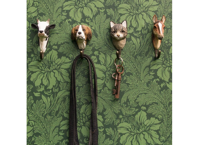 Håndskåret træ, børstemalet, krog i bronzefarvet metal