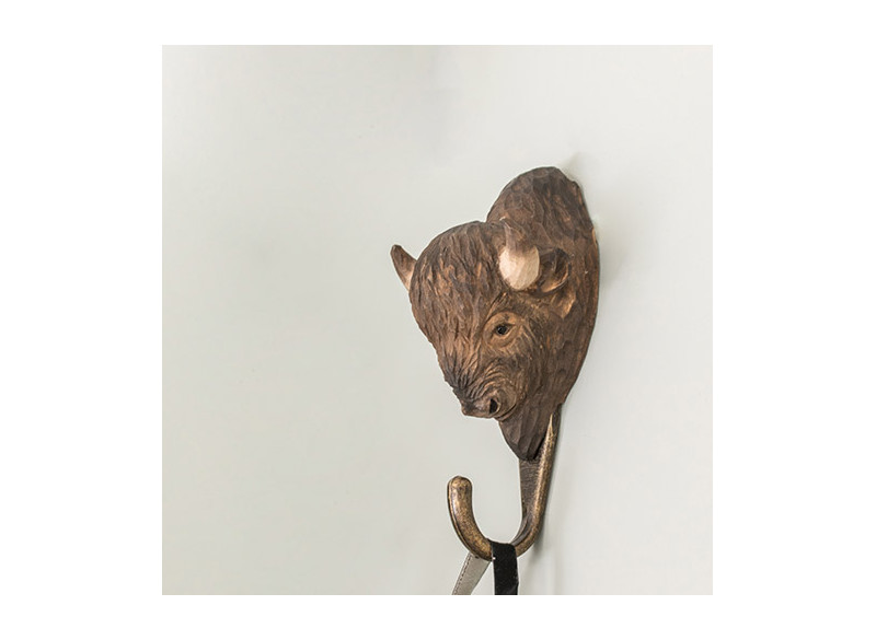 Denne knage er prydet med et Bisonoxe-hoved og er udskåret i hånden i lindetræ og malet i miljøvenlige farver. En sjov detalje og kan passe lige så godt i et køkken, på gangen som i et børneværelse.Passer på væggen som en enkelt indretning, eller hvorfor ikke flere i træk.En blanding af flere forskellige dyrekroge kan også være smukt