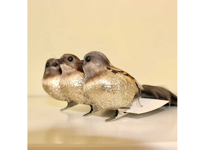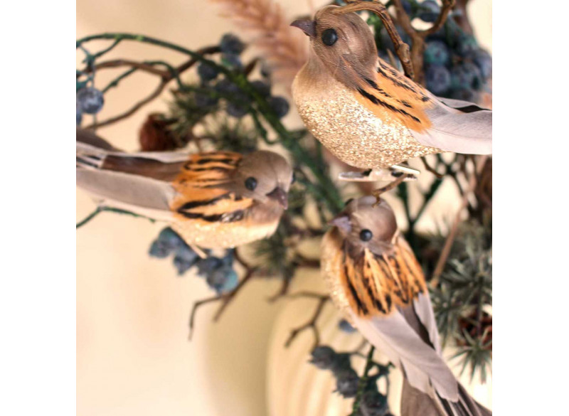 Beautiful elegant bird with long tail feathers. The bird comes in brown and gray shades with gold glitter on the chest which makes it really nice for decoration. With the small clip that sits under the bird, it is easy to attach to a branch or to a decoration or on the Christmas tree. The bird measures about 18 cm.Recipient :