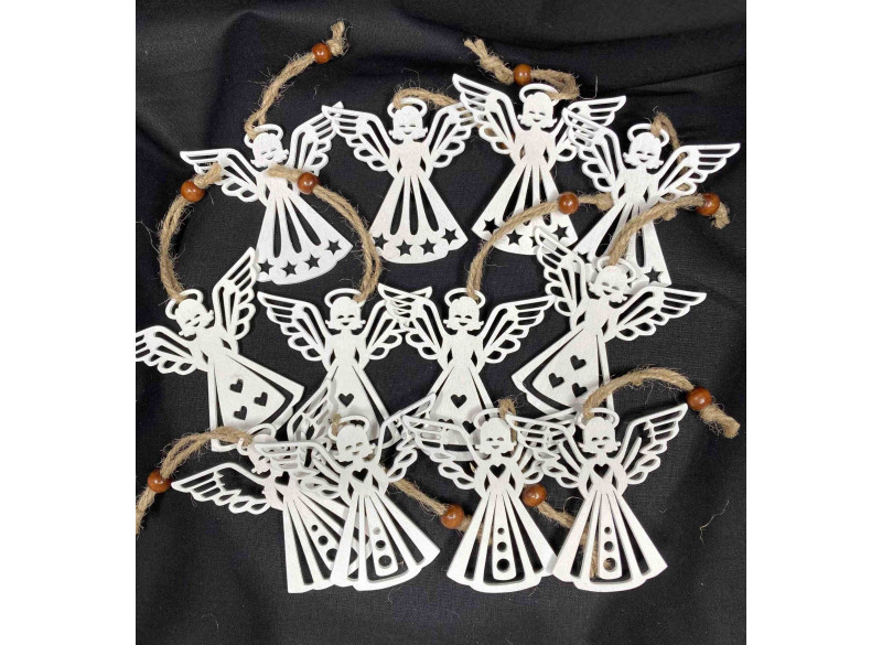 A nice little gift package with 12 ornaments, shaped like angels - 4 of each model. Made of carved wood veneer and suspended in jute ribbon with wooden beads. Painted white on both sides.Recipient :