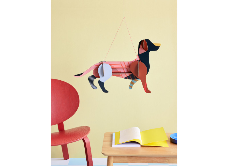 This fun and imaginative 3D object is a dachshund, perfect as a mascot for the children's room. It comes flat packed, made from recycled cardboard and printed with vegetable ink. When assembled, it measures 58.5x13.6x35.3 cm. The package contains two A3 sheets with 13 parts that can be easily assembled. The assembly instructions can be found on the inside of the packaging.Recipient :