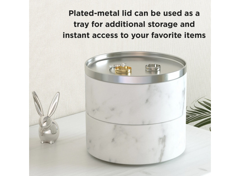 This two tiered jewelry storage box is both pretty and compact. TESORA ’s lid doubles as a tray to store rings or other small pieces and features two bowls that can be stacked or separated to sort and protect jewelry.