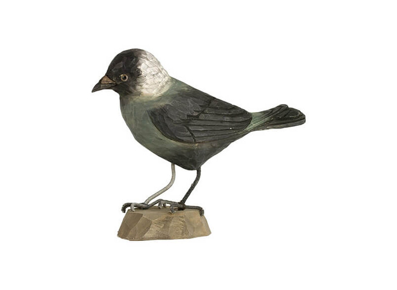 DecoBird jackdaw is a hand carved, hand painted lifelike interpretation of the cocky and charismatic jackdaw. The pale-grey eyes and the distinctive strolling gait makes the jackdaw easy to recognize. They are intelligent, social creatures and live in complex social groups in both cities and woodlands. They have a tendency to build their nests in chimneys that often results in chaos for both the jackdaw and the house residents.